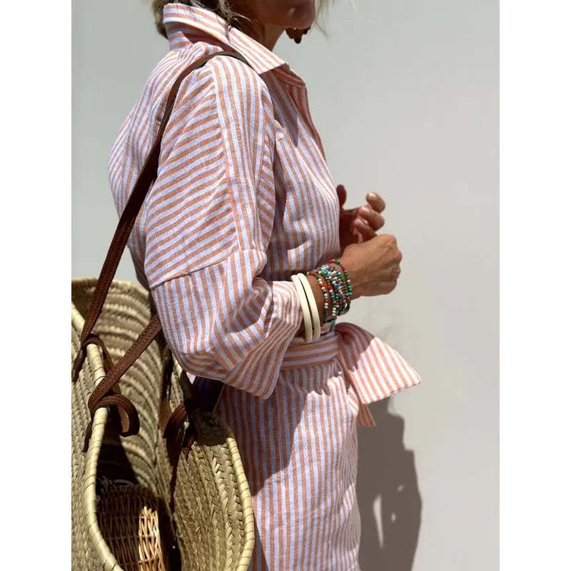 Elevate your summer wardrobe with Mina classic striped summer shirt dress. Crafted from premium, lightweight vegan linen, this dress ensures you stay cool and comfortable even on the hottest days.