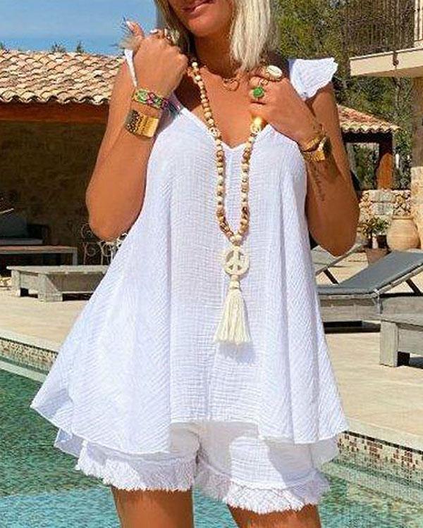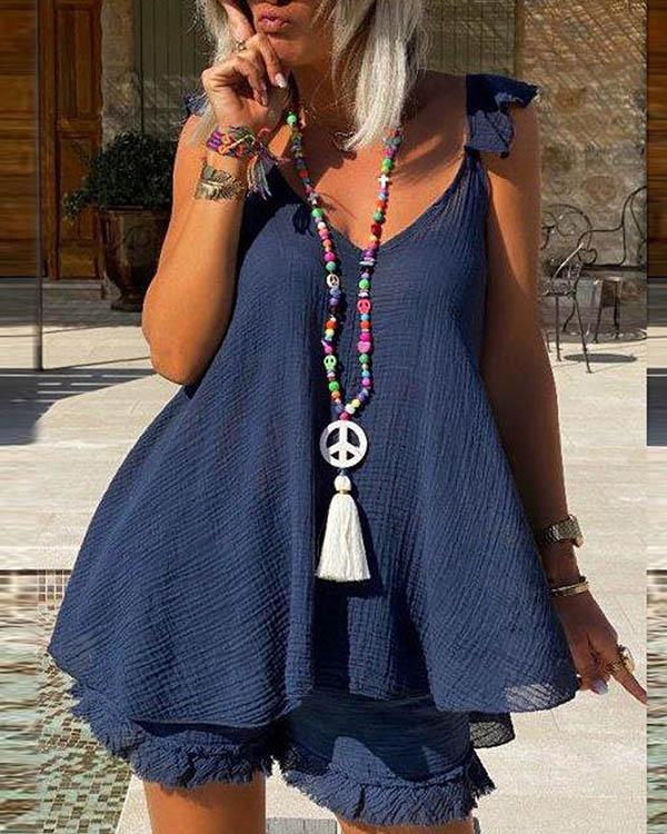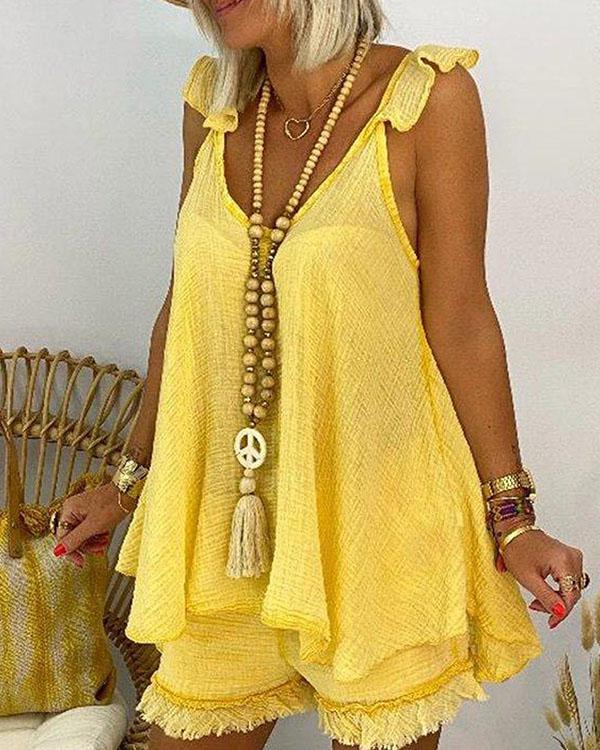 Plus Size Cotton Linen Sleeveless Tassel Shorts Set