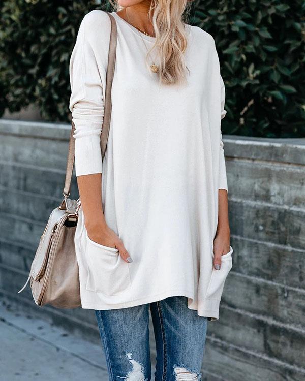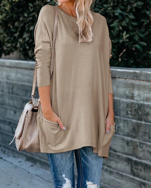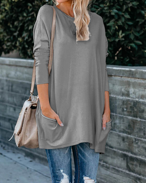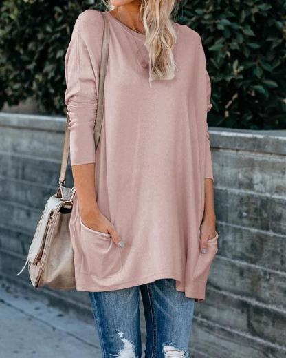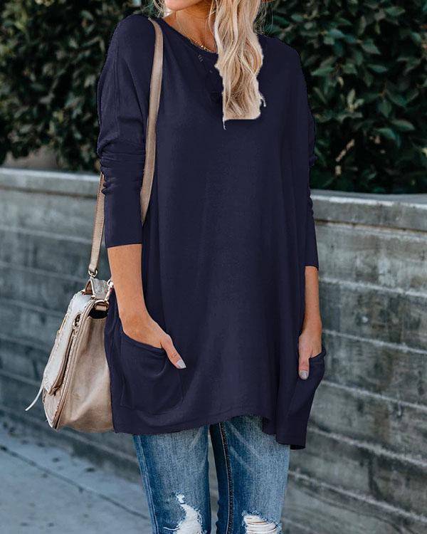 Plus Size Women Cotton Plain Color Pockets Long Sleeve Top