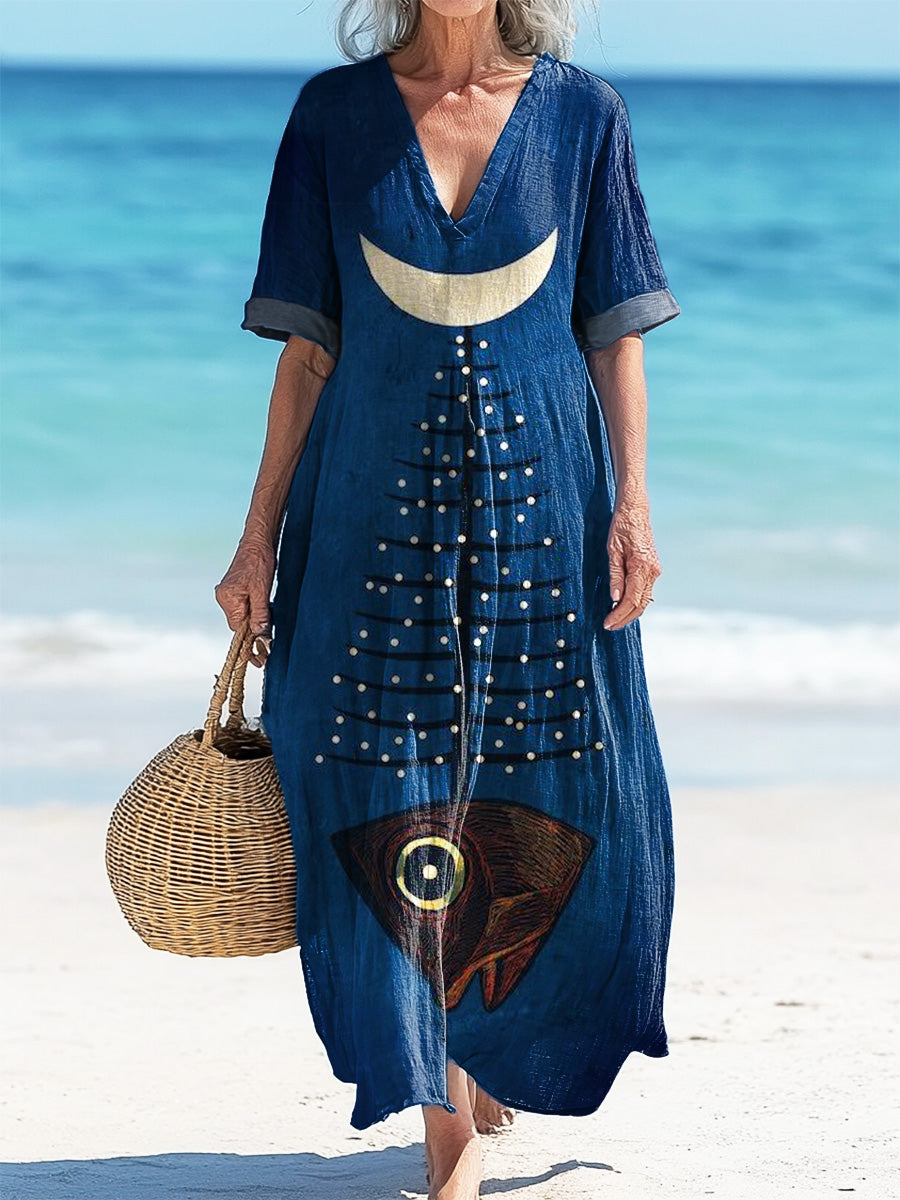 Vintage V-Neck Fish Art Print Elegant And Chic Loose Midi Dress