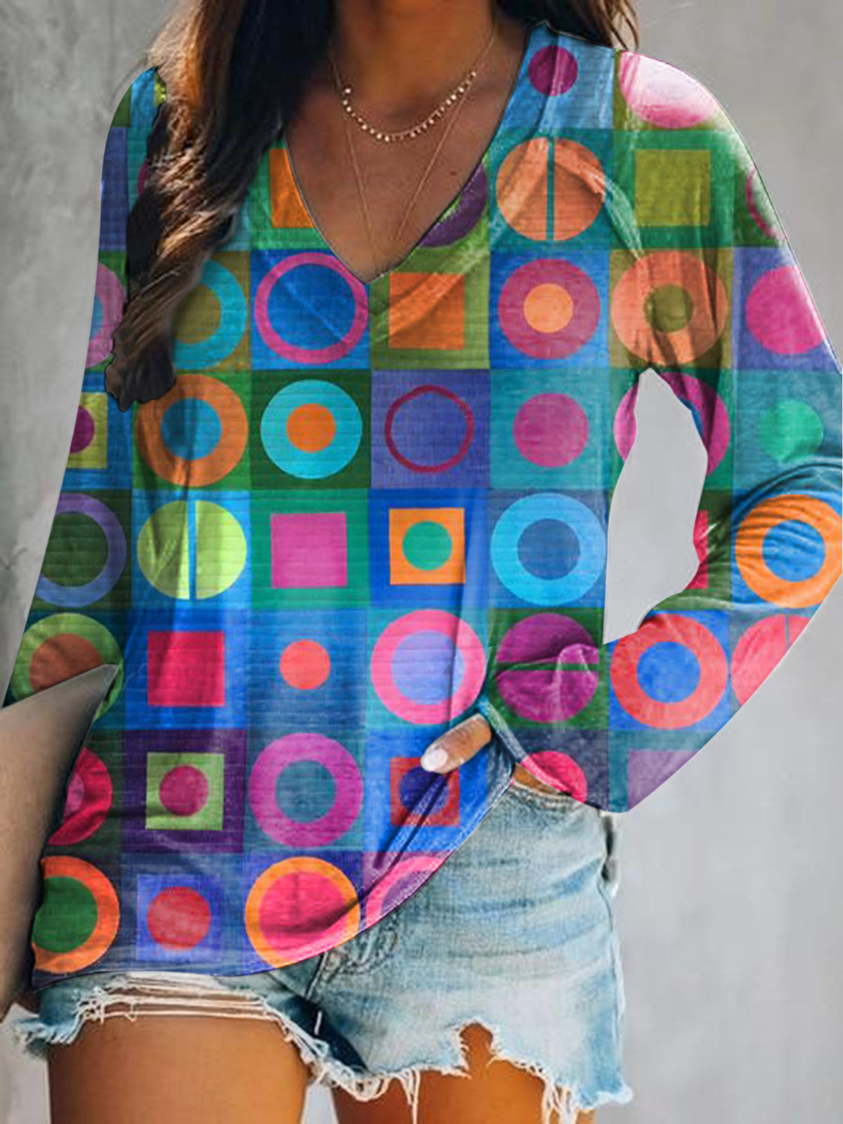 Women's Casual Retro Abstraction Art Print V Neck Long Sleeve Tops