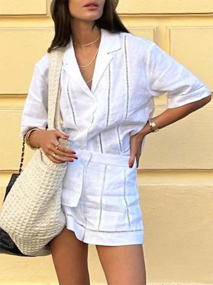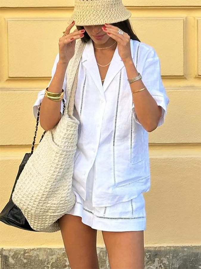 Women's Cotton And Linen Hollow Stitching Design Top And Pants Two-Piece Suit