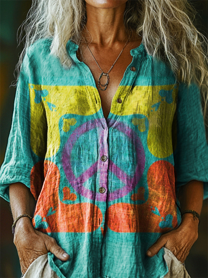 Women's Hippie Love Art Print Casual Cotton Linen Shirt