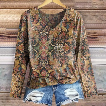 Women's Retro Ethnic Totem Pattern Print Casual V-neck Long Sleeve T-shirt