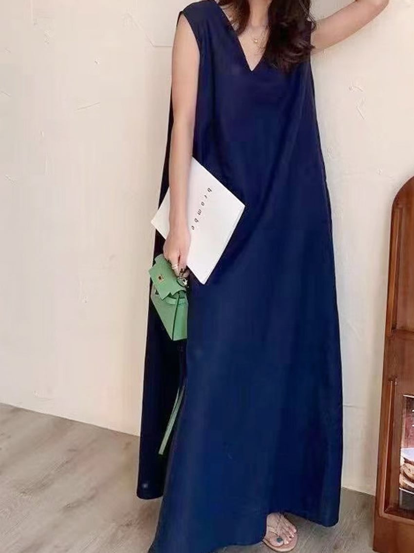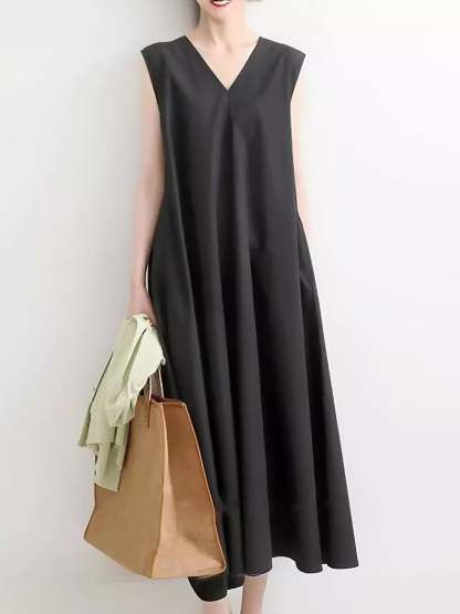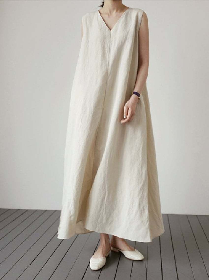 Women's Simple Solid Color Cotton and Linen V-Neck Knee-length Hem Long Skirt