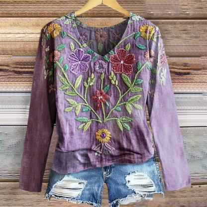 Women's Vintage Ethnic Floral Art Print Casual V-neck Long Sleeve T-shirt