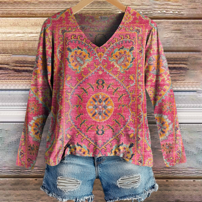 Women's Vintage Ethnic Floral Art Print Casual V-neck Long Sleeve T-shirt
