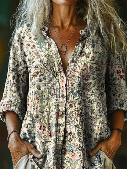 Women's Vintage Floral Art Print Casual Cotton Linen Shirt