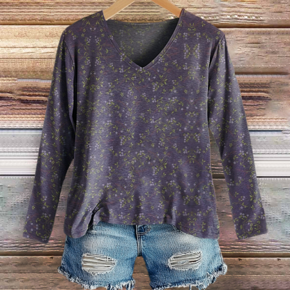 Women's Vintage Floral Art Print Casual V-neck Long Sleeve T-shirt