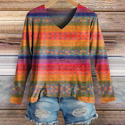 Women's Vintage Floral Art Print Casual V-neck Long Sleeve T-shirt