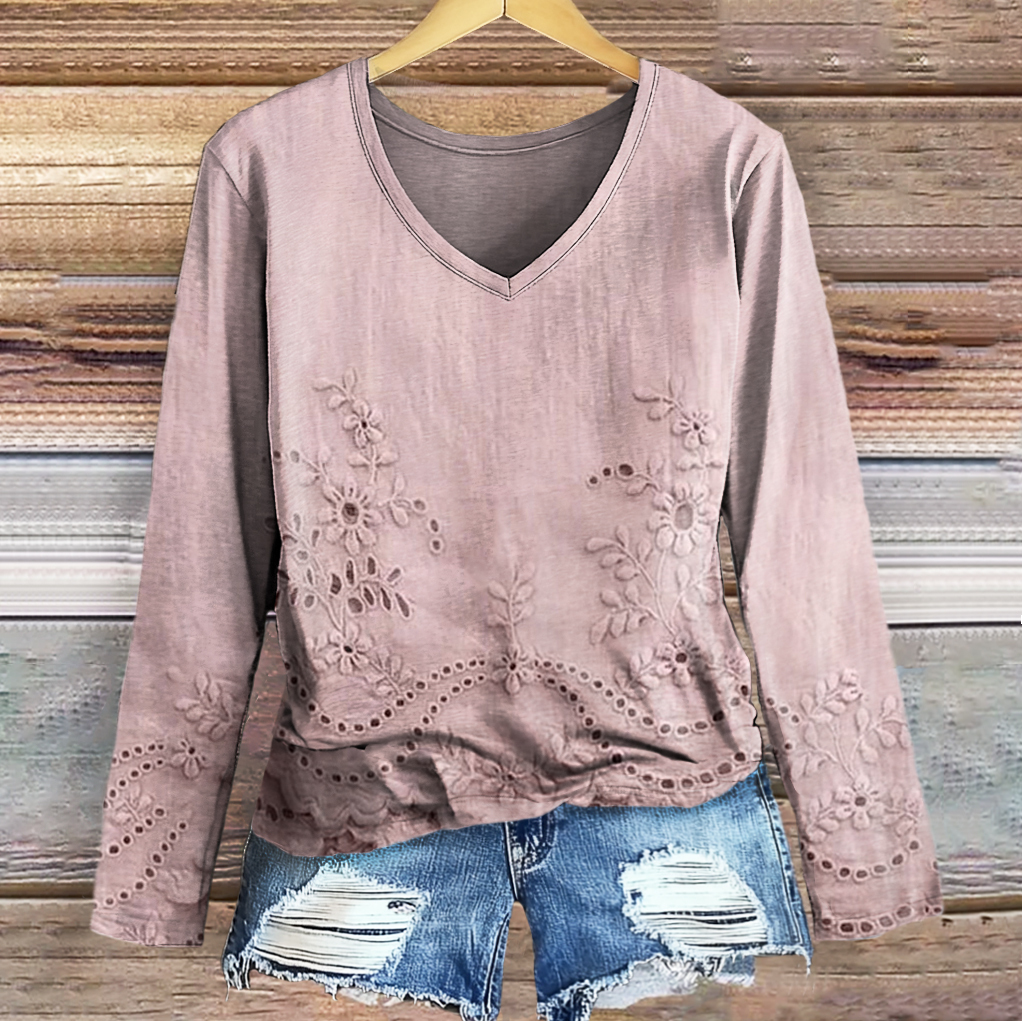 Women's Vintage Floral Texture Patterns Print Casual V-neck Long Sleeve T-shirt