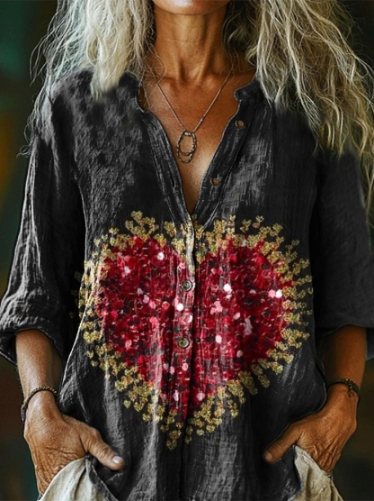 Women's Vintage Heart Shaped Art Pattern Print Casual Cotton Linen Shirt
