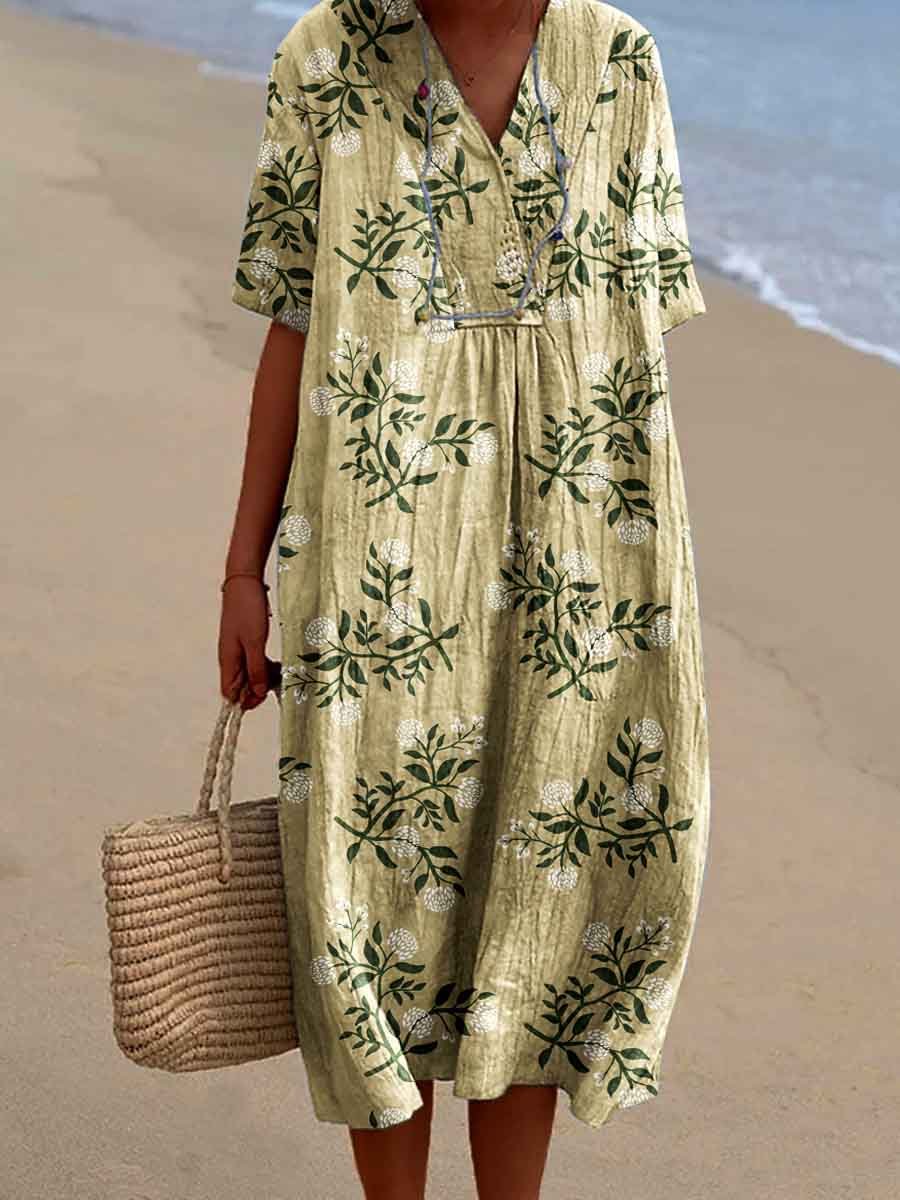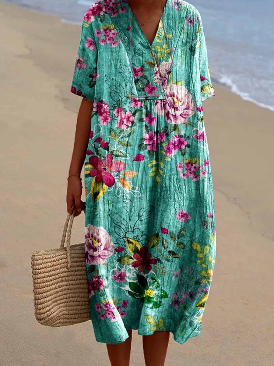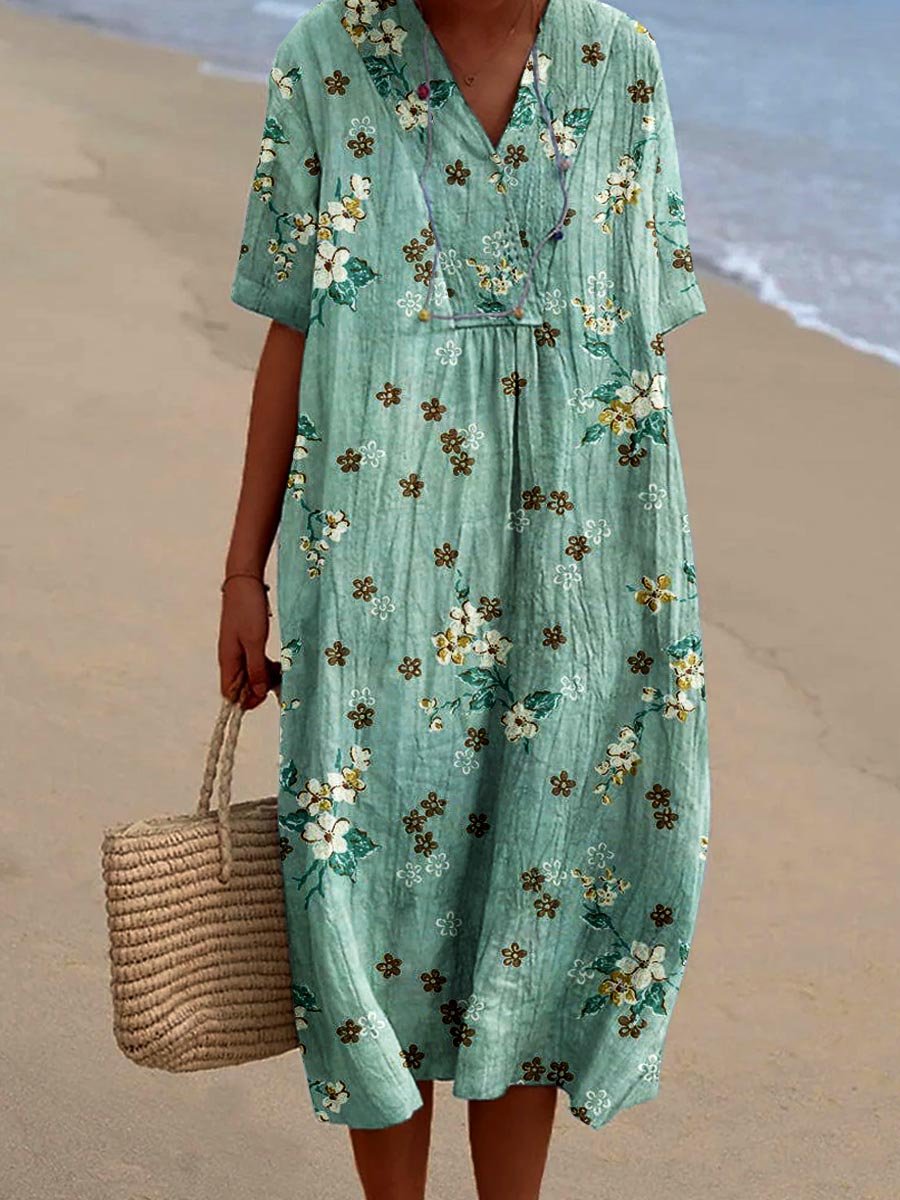 Women's Resort Style Flower Pattern Cotton and Linen V-Neck Dress