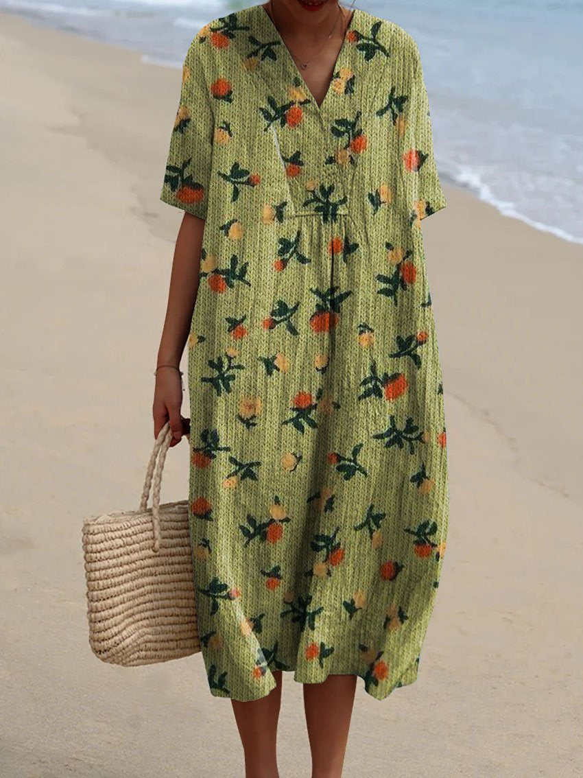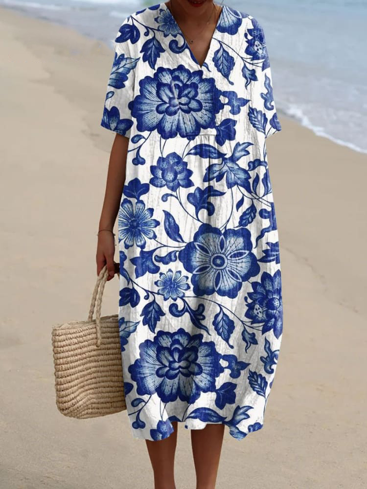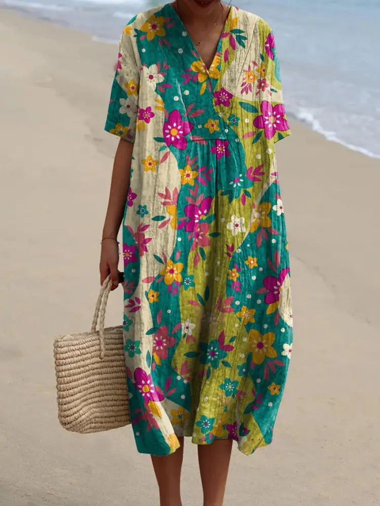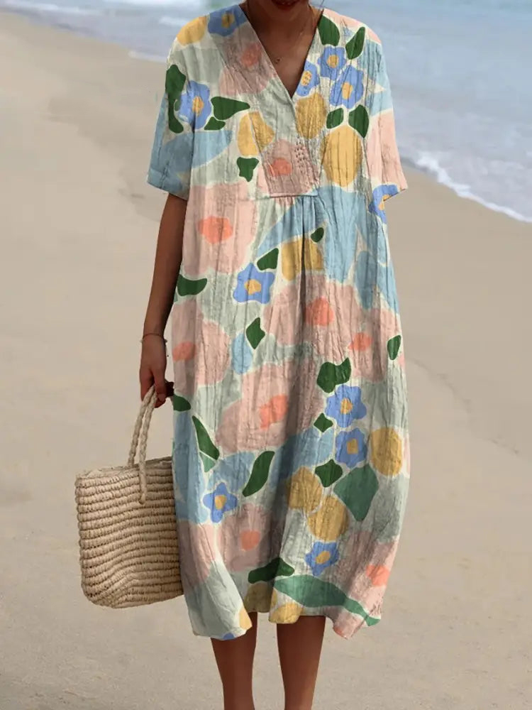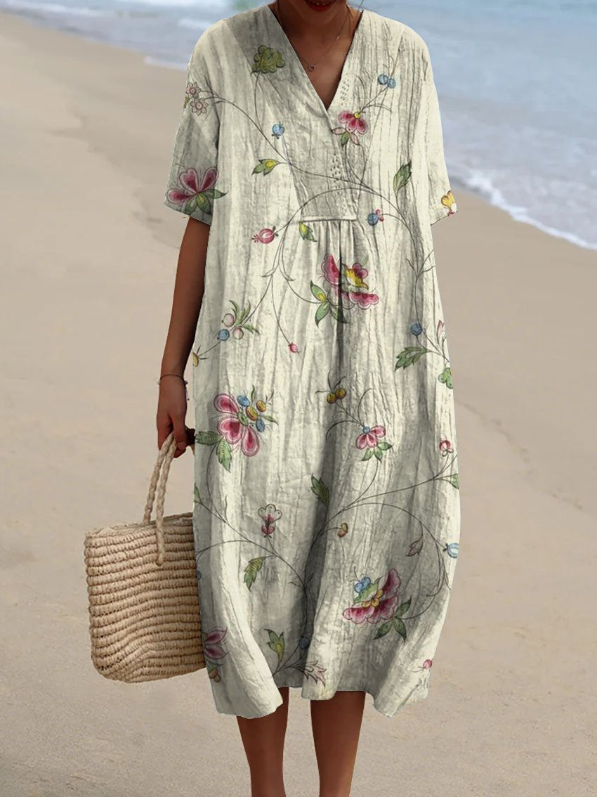 Women's Resort Style Flower Pattern Cotton and Linen V-Neck Dress