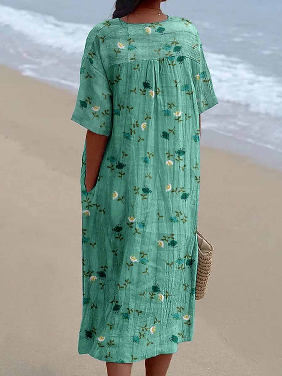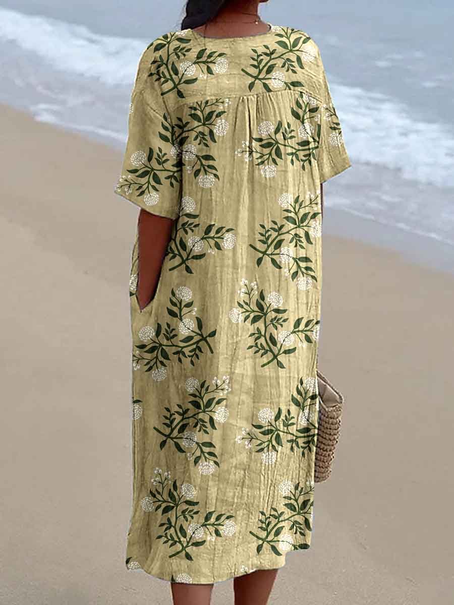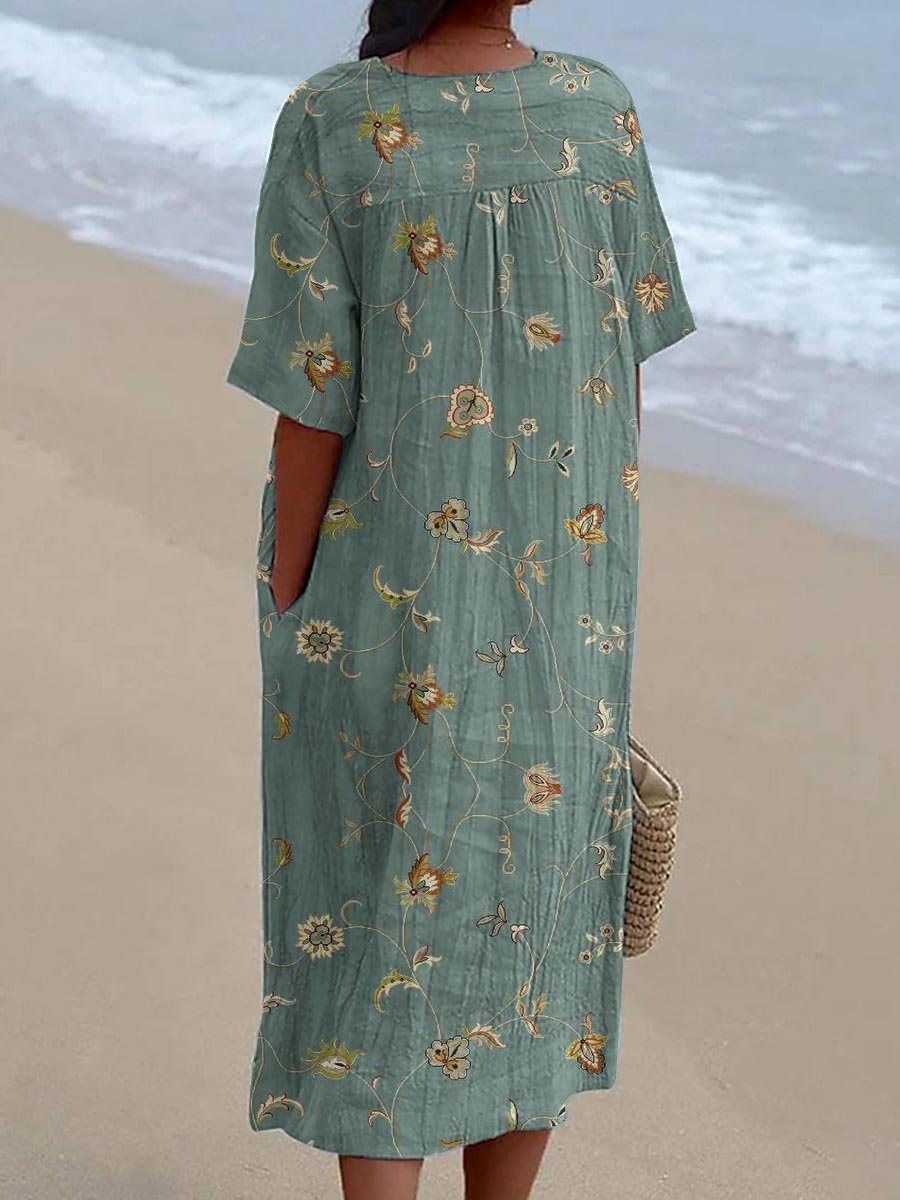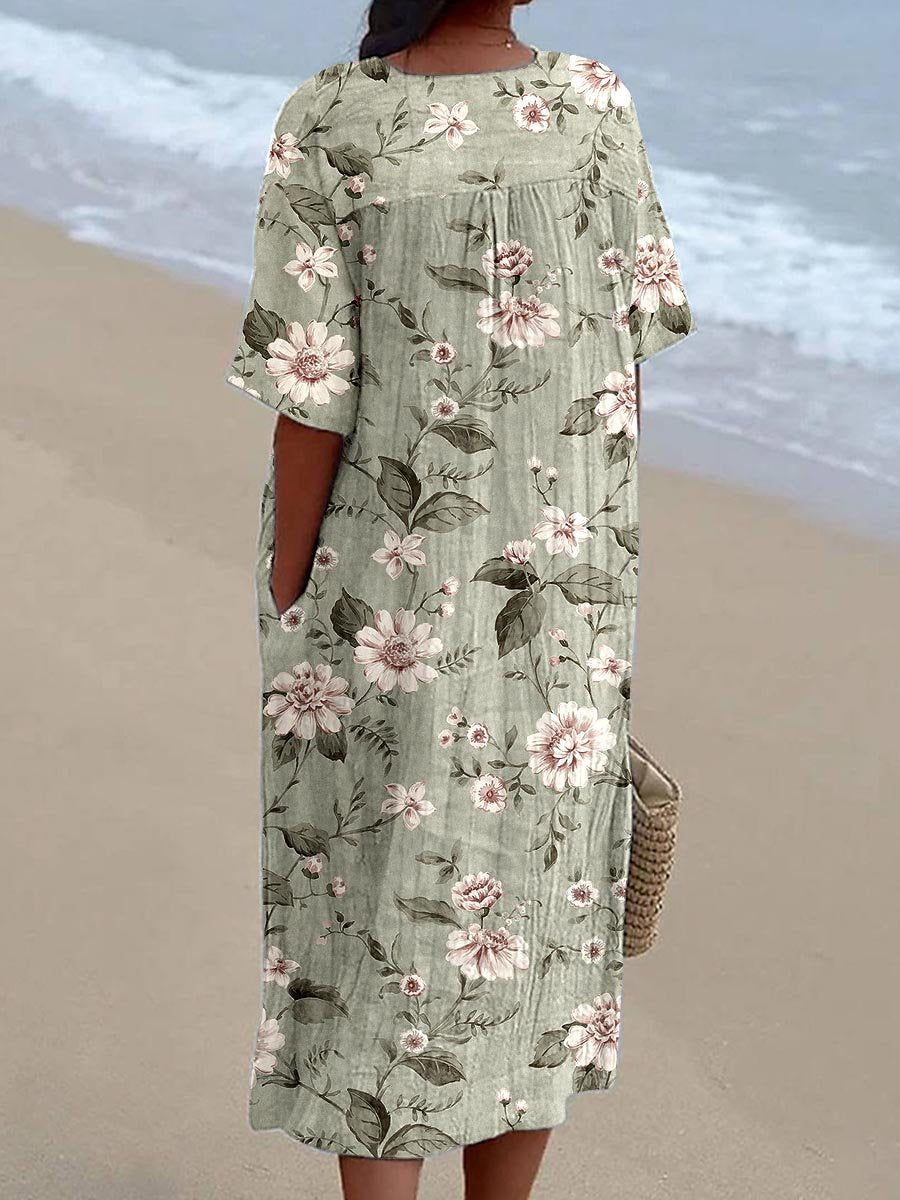 Women's Seaside Resort Floral Pattern Cotton and Linen Dress