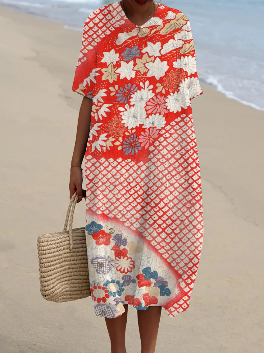 Japanese Floral Print Women's V-Neck Pocket Short Sleeve Dress