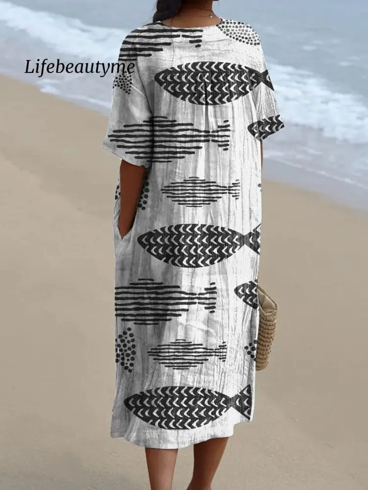 Women's Vintage Lovely Fish Art Print Flowy Dress