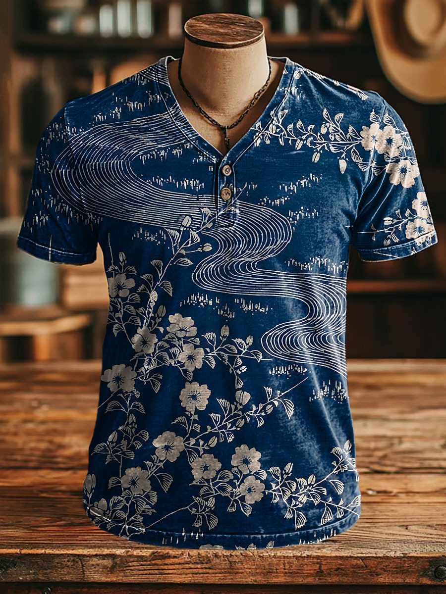 Blue ethnic floral pattern Striped arc Vintage Print Casual Cotton Henry Collar Tshirt