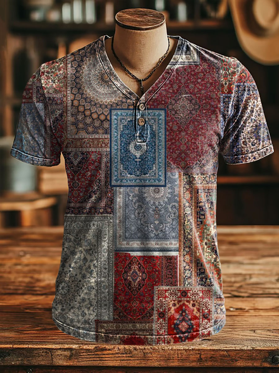 Vintage Ethnic style patterns Patchwork Print Casual Cotton Henry Collar Tshirt