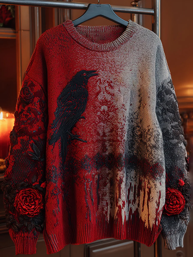 Vintage Halloween Raven Art Chunky Knitted Sweater