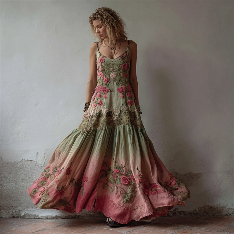 Vintage Pink Roses Natural Gradient Flowy Linen Maxi Dress