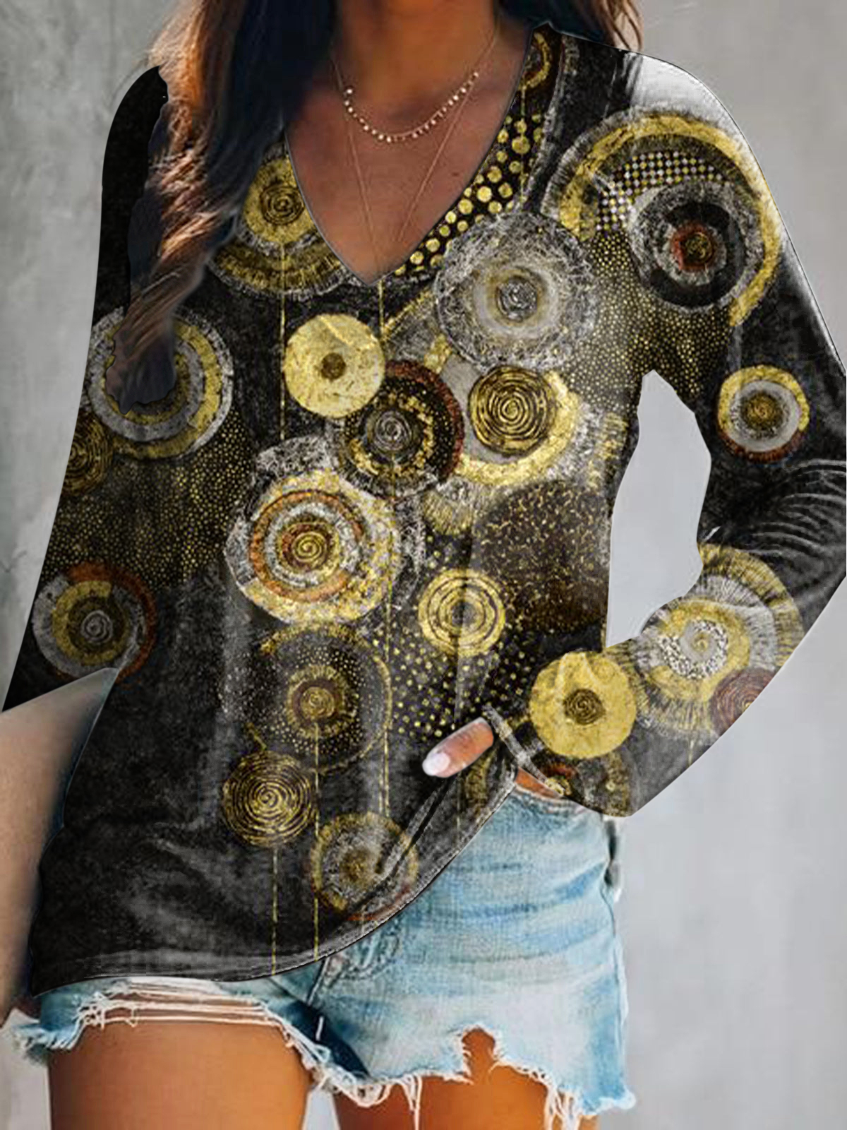 Women's Casual Bohemian Floral Art Print V Neck Long Sleeve Tops