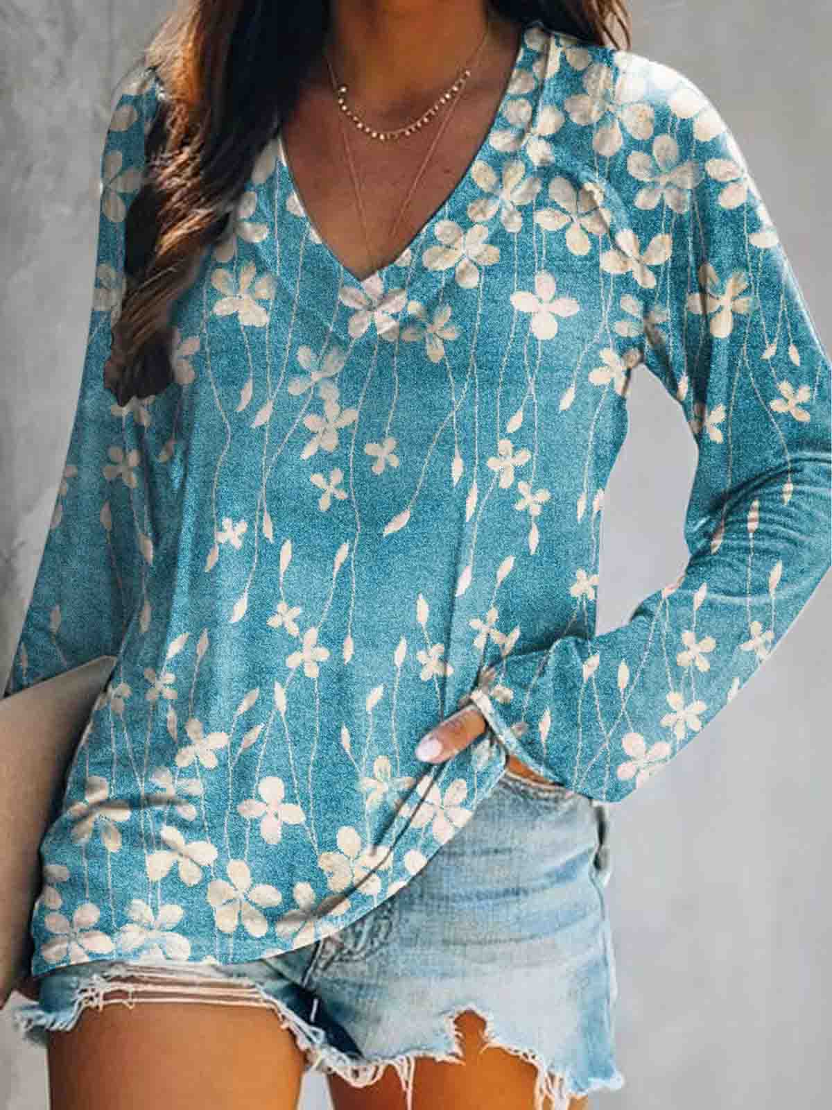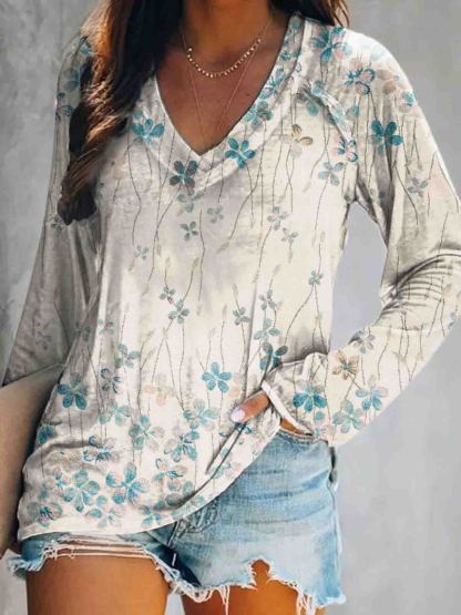 Women's Floral Art Print V-Neck Long Sleeve Top