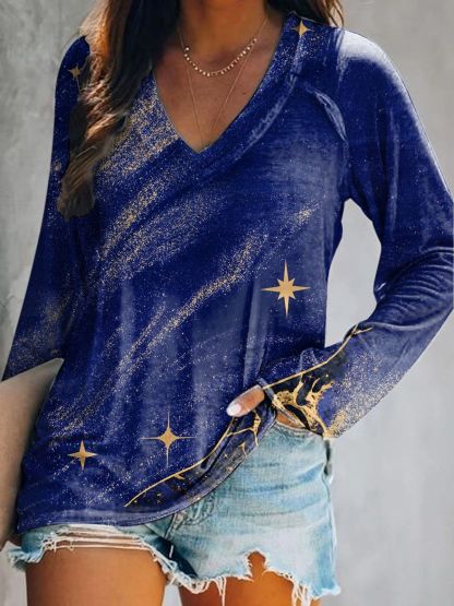 Women's Starry Night Art Print V-Neck Long Sleeve Top